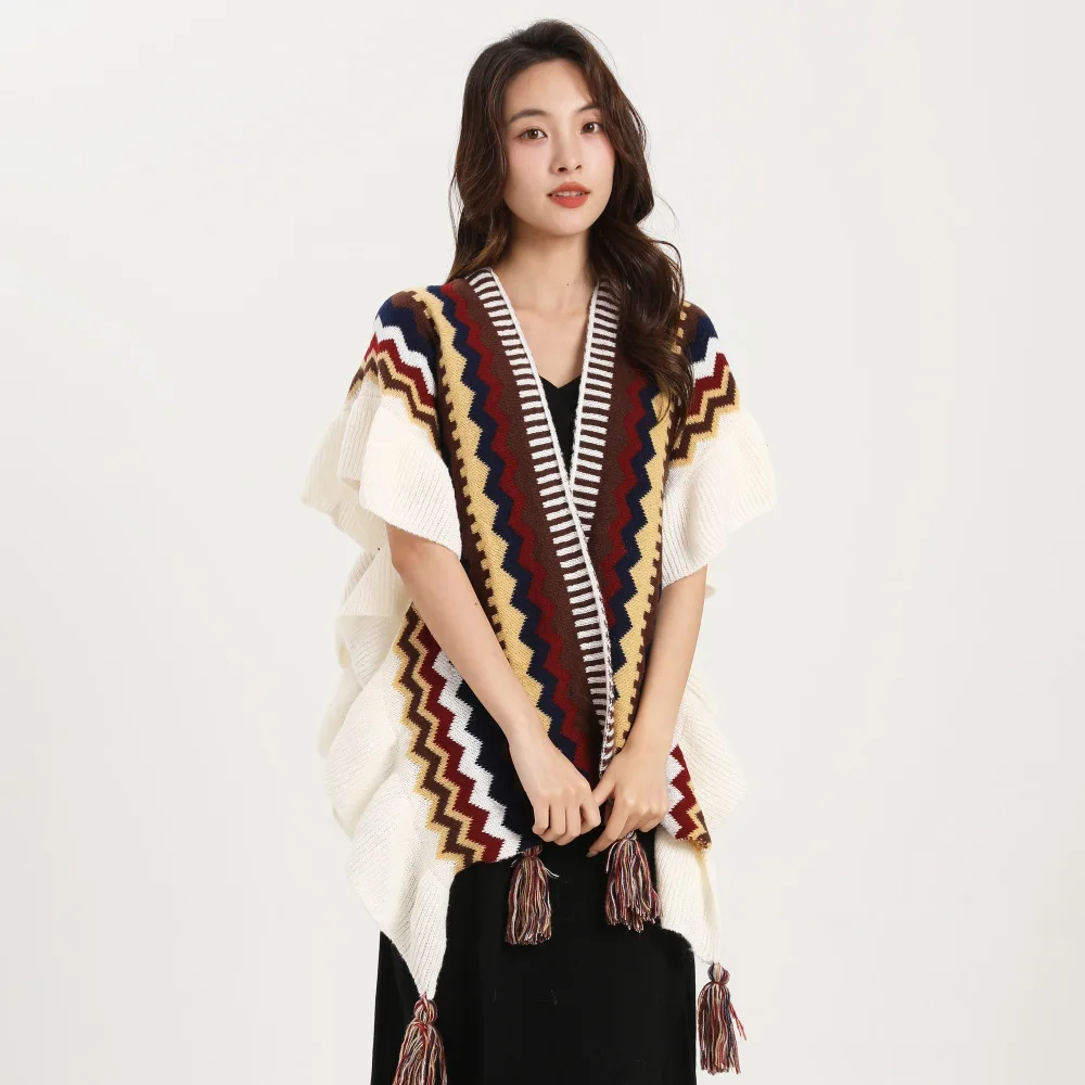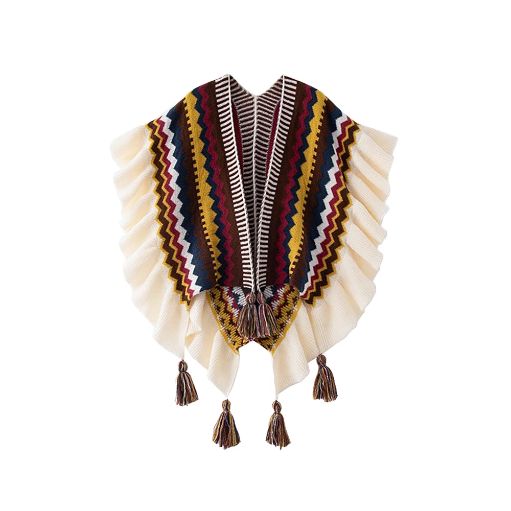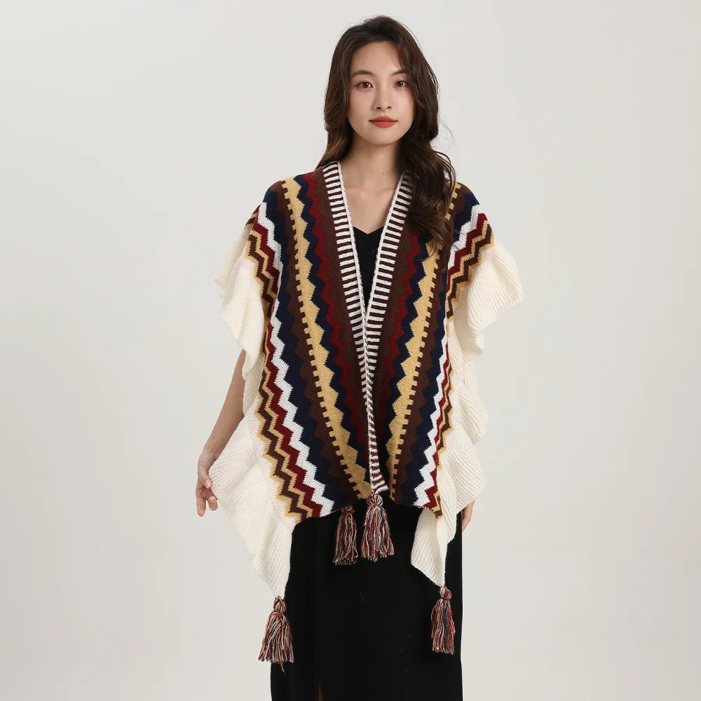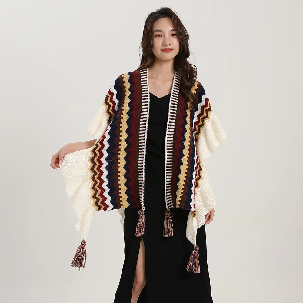 Echarpe De Luxe Style Châle Bohème Pour Femme Cardigan En Mohair Tricoté À Pompons Rétro Ethnique Écharpe À Volants Rayée Pour Voyage : votre nouvel allié