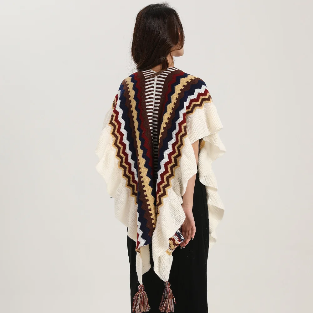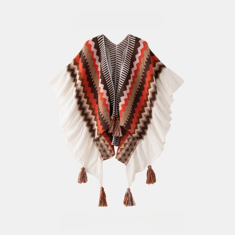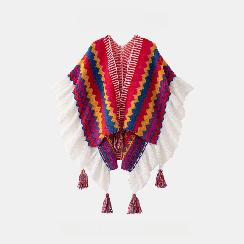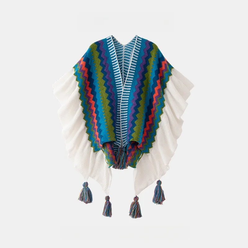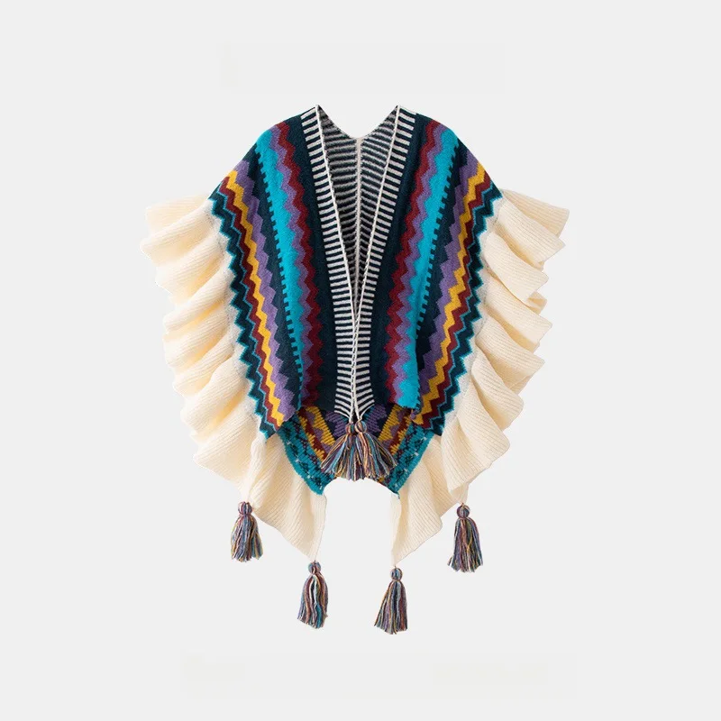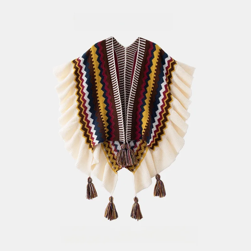 Echarpe De Luxe Style Châle Bohème Pour Femme Cardigan En Mohair Tricoté À Pompons Rétro Ethnique Écharpe À Volants Rayée Pour Voyage : votre nouvel allié