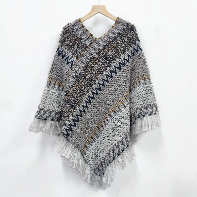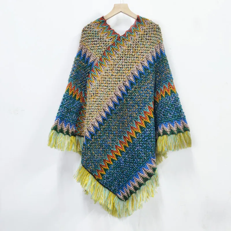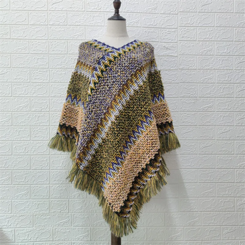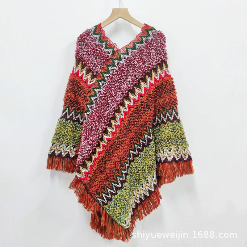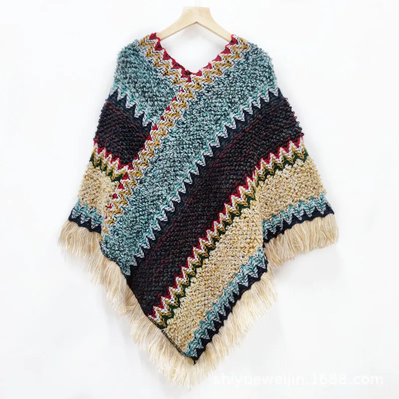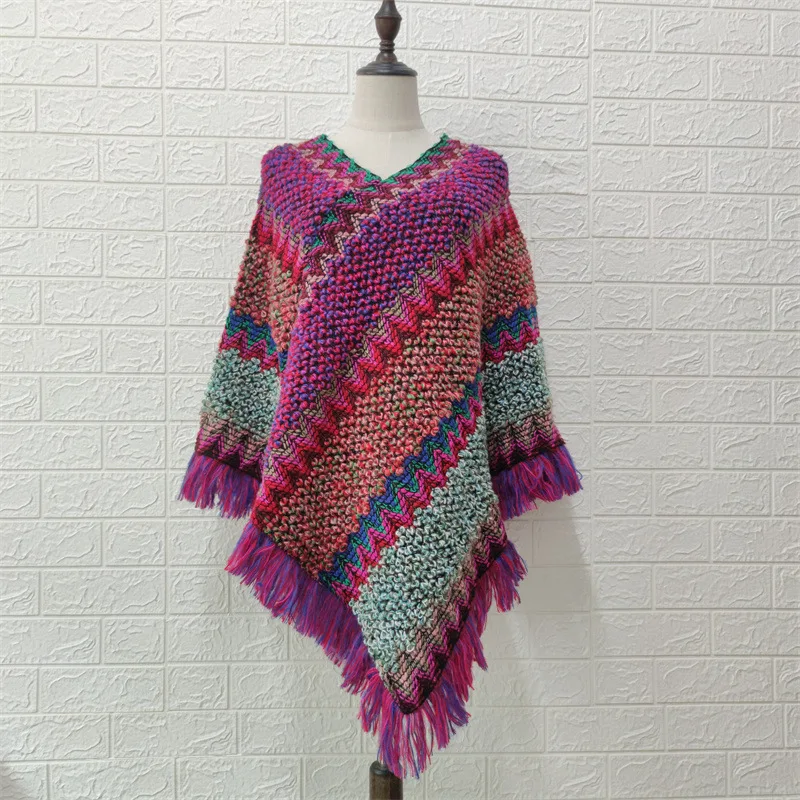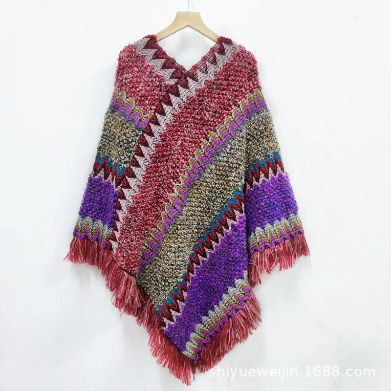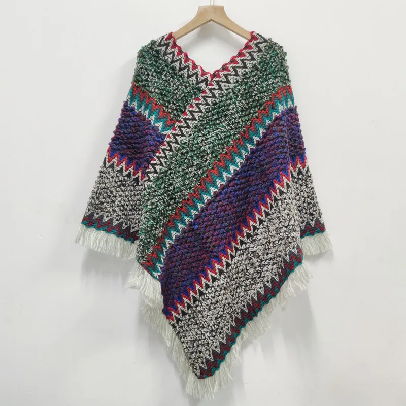 Offrez-vous un Echarpe Femme Style Cape Tricotée Colorée Pour Femme Poncho Ethnique Avec Pompon Châle Chaud